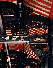 Exposed structural elements allow air to circulate in halls filled with smoke from joss sticks. The painted beams are treated as part of the temple ornamentation, with red extensively used to symbolise the sun and the male Yang principle. Red also suggests joy, prosperity and festivity. Not a single nail was used in the wooden construction of the main shrine hall a testimony to the master builders skill in carpentry.